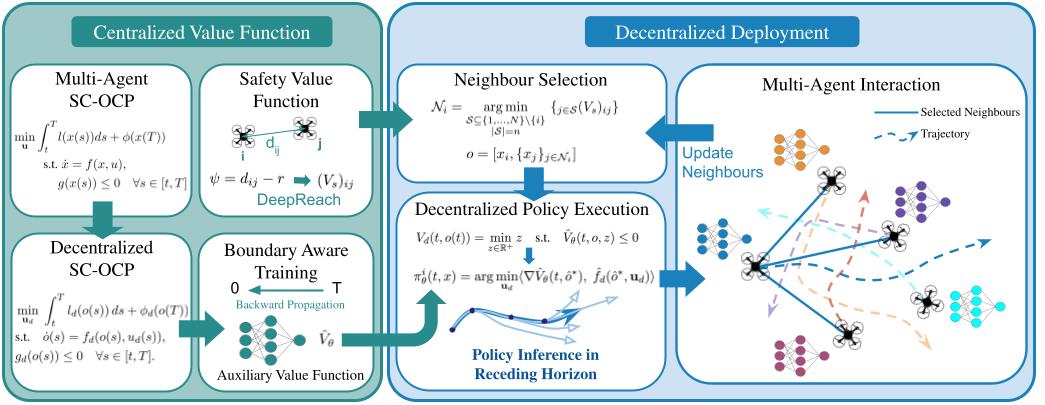 Co-optimizing safety and performance in large-scale multi-agent systems remains a fundamental challenge. Existing approaches based on multi-agent reinforcement learning (MARL), safety filtering, or Model Predictive Control (MPC) either lack strict safety guarantees, suffer from conservatism, or fail to scale effectively. We propose MAD-PINN, a decentralized physics-informed machine learning framework for solving the multi-agent state-constrained optimal control problem (MASC-OCP). Our method leverages an epigraph-based reformulation of SC-OCP to simultaneously capture performance and safety, and approximates its solution via a physics-informed neural network. Scalability is achieved by training the SC-OCP value function on reduced-agent systems and deploying them in a decentralized fashion, where each agent relies only on local observations of its neighbours for decision-making. To further enhance safety and efficiency, we introduce an Hamilton-Jacobi (HJ) reachability-based neighbour selection strategy to prioritize safety-critical interactions, and a receding-horizon policy execution scheme that adapts to dynamic interactions while reducing computational burden. Experiments on multi-agent navigation tasks demonstrate that MAD-PINN achieves superior safety–performance trade-offs, maintains scalability as the number of agents grows, and consistently outperforms state-of-the-art baselines.